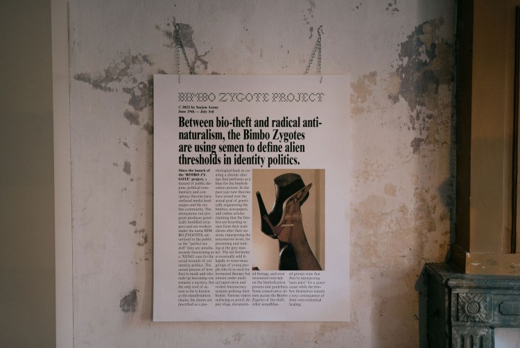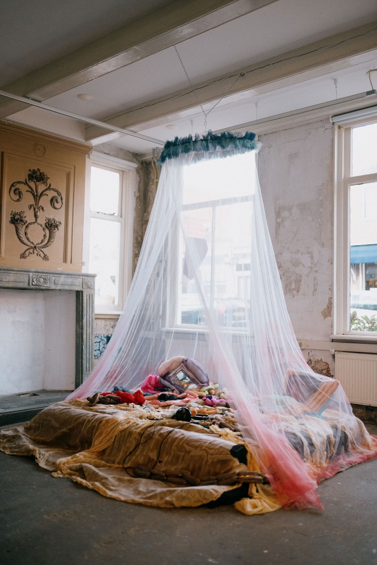 Sarjon Azouz’ installation, titled Bimbo Zygote Project, is a literal carrier or capsule of sorts. It is a bed with pillows that contain screens showing a video work where another world, an alternative view on being human, unfolds. In this beyond-human world presented by Azouz, genetically engineered sex workers with chronic alter egos (the Bimbos) trade in testosterone on the grey market. A vlog-style video, combining tiktok clips of one of the Bimbos talking about her daily life as a sex worker, is interspersed with feverish spinning shots of multiple Bimbo figures posing and running through a desolate space, while a voiceover recites a manifesto about these creatures. This recent graduation work is exemplary of Azouz’ artistic practice, in which vanity, alienation and identity politics are important themes. Seductive and conveying a feeling that lies somewhere between existential crisis and hilarious camp, the universe created by Azouz is one of many alter-egos—extensions of the self. Through these characters the artist seeks to reclaim the narrative imposed upon them.