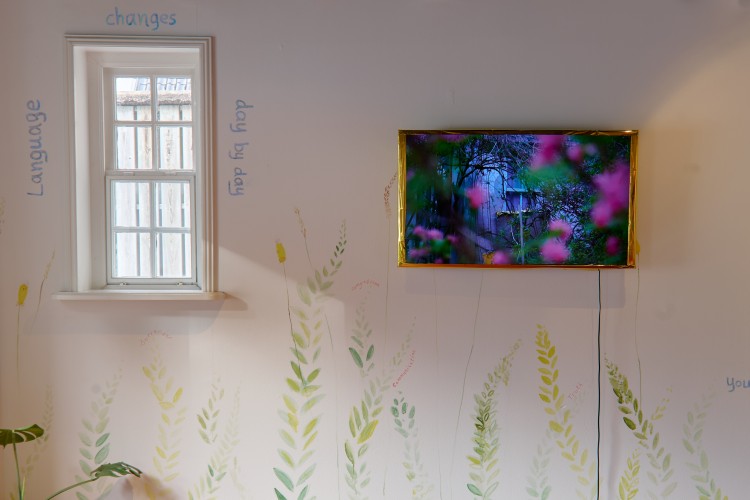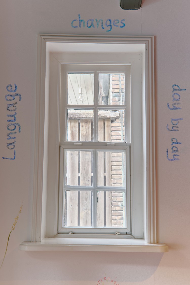 In the site specific installation To Live in Words, Rory Pilgrim explores the question of home and friendship in relation to their friend and guiding star Louwrien Wijers. Bringing together materials made over the last three years, Rory introduces the beginning of a long term film currently in production. Creating a wall drawing of the surrounding fields and nature of Wijers home in Friesland, Pilgrim wrote words from their conversations, which act as seeds from the present and future.