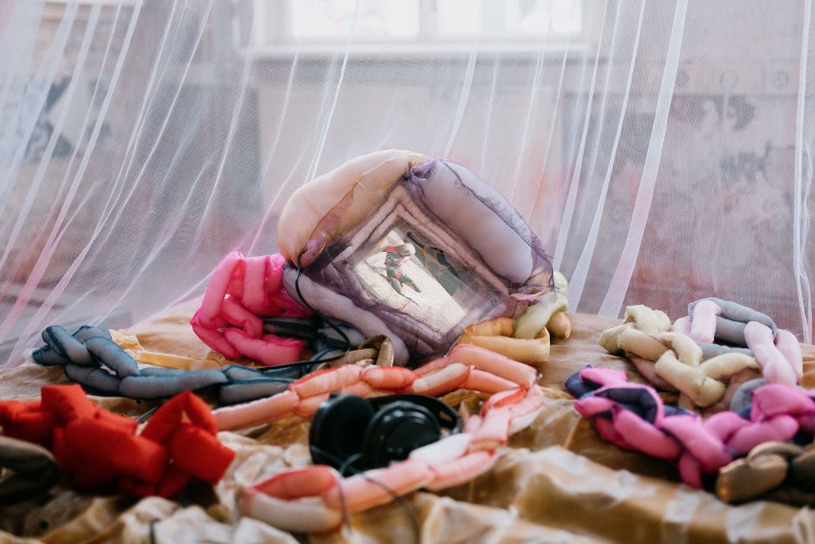 Sarjon Azouz’ installation, titled Bimbo Zygote Project, is a literal carrier or capsule of sorts. It is a bed with pillows that contain screens showing a video work where another world, an alternative view on being human, unfolds. In this beyond-human world presented by Azouz, genetically engineered sex workers with chronic alter egos (the Bimbos) trade in testosterone on the grey market. A vlog-style video, combining tiktok clips of one of the Bimbos talking about her daily life as a sex worker, is interspersed with feverish spinning shots of multiple Bimbo figures posing and running through a desolate space, while a voiceover recites a manifesto about these creatures. This recent graduation work is exemplary of Azouz’ artistic practice, in which vanity, alienation and identity politics are important themes. Seductive and conveying a feeling that lies somewhere between existential crisis and hilarious camp, the universe created by Azouz is one of many alter-egos—extensions of the self. Through these characters the artist seeks to reclaim the narrative imposed upon them.